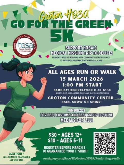 Aberdeen, SD (Hub City Radio) The Groton HOSA 5k Run for the Green is right around the corner and they are hoping to help raise money to send students on a Medical Mission Trip. Advisor Brittany Hubbert gives us an overview of HOSA. Students from Groton joined in to explain some of what they expect… Read more »