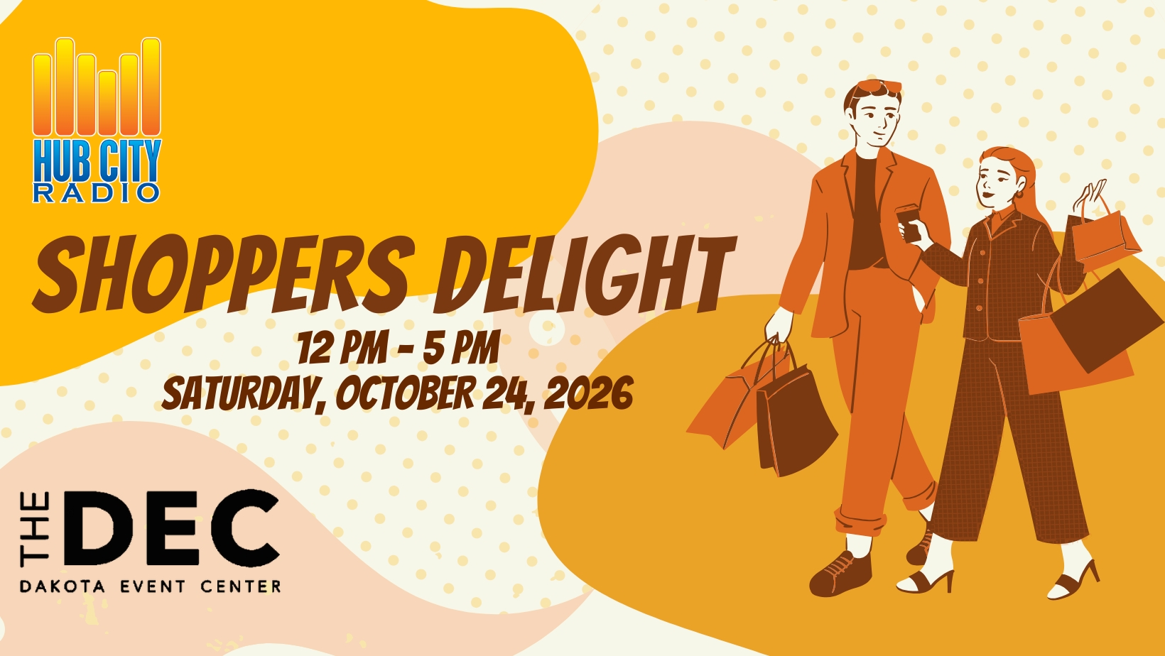 The 17th Annual Hub City Radio’s Shopper’s Delight Vendor Show is October 24 at the Dakota Event Center in Aberdeen, SD from Noon to 5pm. Grab your friends and enjoy shopping at our many booths. Limited booth space is available! Please call Tammie at 605-229-3632 Monday – Friday 8am-5pm or email tammiebader@hubcityradio.com for more information.