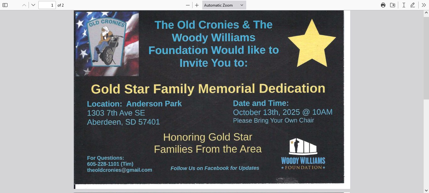 ABERDEEN, S.D.(HubCityRadio)- Woody Williams Foundation in conjunction with the Old Cronies are doing the Gold Star Family Memorial Dedication at Anderson Park in Aberdeen on... Read More